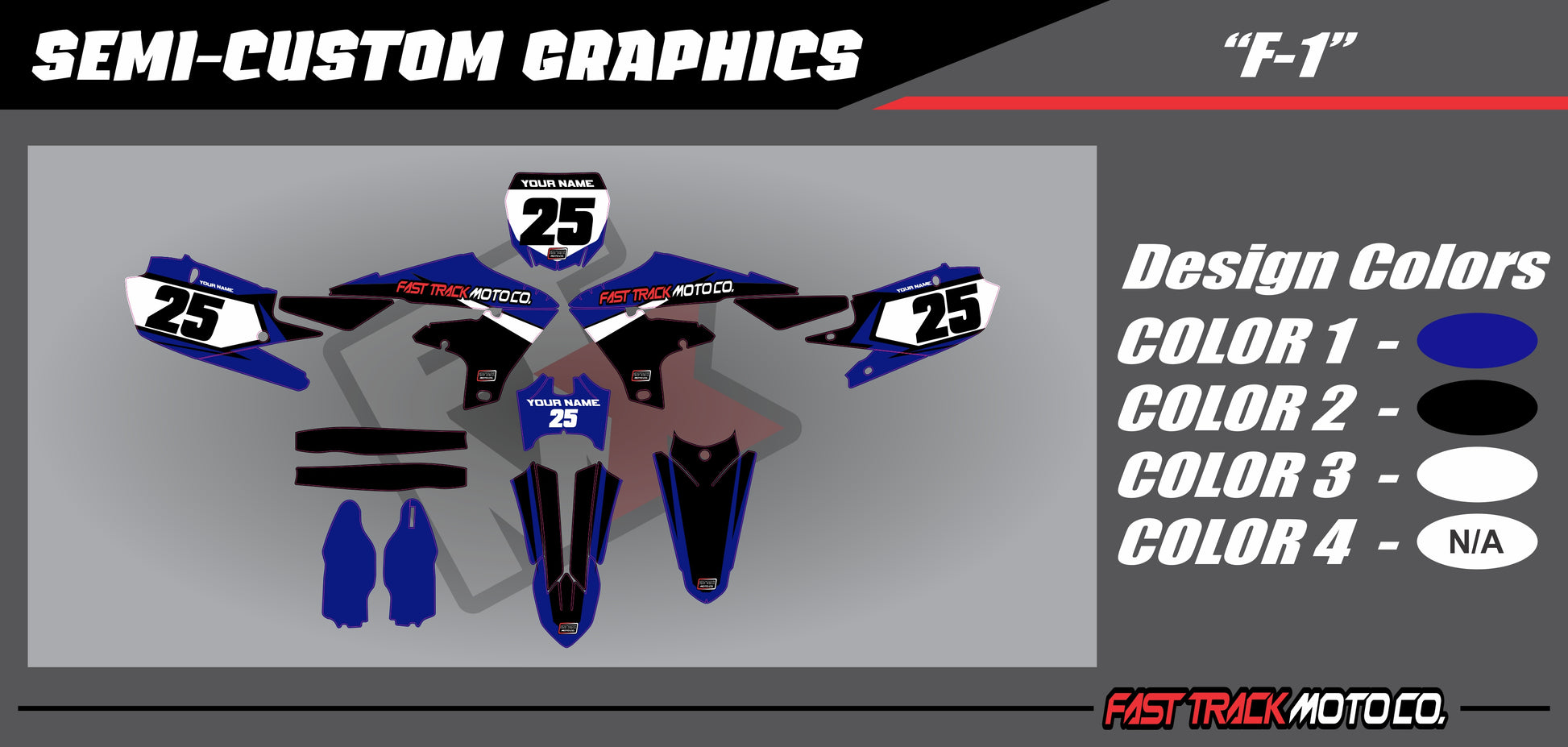 Each semi-custom kit includes decals for the radiator shrouds, front and rear fenders, all number plates, air box, lower fork guards and swing arm.